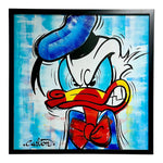 In this work dedicated to Donald Duck, Trevor Carlton reinterprets the famous Disney character with his signature street-pop energy. Donald’s face, shown in a close-up, bursts with an angry and exaggerated expression: bold black lines, dynamic contours, and strong color choices give the character a renewed and immediate intensity.
