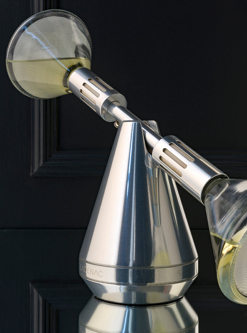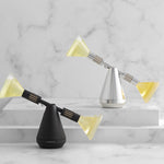 The Royale "Balance Argento" diffuser is an innovative design object that combines contemporary aesthetics, technology, and high-end ambient perfumery. Crafted from anodized silver aluminum, it stands out for its elegant and minimalist structure, designed to seamlessly integrate into modern and refined environments. The diffusion system utilizes a counterweight mechanism, enabling the fragrance to diffuse through natural evaporation, combining principles of physics and design into a single decorative element. The diffuser includes a high-quality glass bottle of 100 ml, characterized by a design that visually evokes the contained fragrance. The fragrance longevity is approximately 6-8 weeks, ensuring a constant and delicate diffusion in the environment. Compatible with Royale fragrances, it offers a sophisticated and customizable olfactory experience. Perfect for domestic or professional environments, this diffuser represents an ideal balance between function and style, transforming the home fragrance into a unique sensory experience.