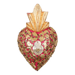 Wall decoration with a flaming 3D heart, completely adorned with gold or silver-plated Milagros devotional pendants, applied by hand and nailed to the wooden base. Ex Voto - Good Luck Charms.