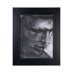 Pencil 7 presents a male portrait in chiaroscuro, created with a rich and deliberately irregular graphic texture. The face is captured in an introspective pose: the downward gaze, the sharp shadows under the eyebrows and around the mouth define the structure without ever resorting to rigid contours.