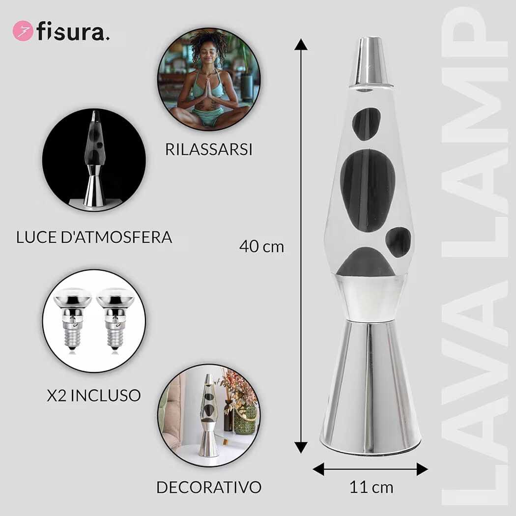 The lava lamp "Bullet" with black liquid and a silver metal and glass base is a clean and minimalist design accent, perfect for contemporary and sophisticated spaces. The contrast between the silver metal base and the dark liquid inside the glass bottle creates an elegant visual effect, while the slow movement of the illuminated wax generates a relaxing and evocative atmosphere. Ideal for living rooms, bedrooms, studios, or offices, it adds a touch of design without weighing down the space. The lamp measures 40 cm in height and 11.5 cm in width, dimensions that are perfect for shelves, desks, or side tables. Made of metal, glass, and wax, it operates on 220V voltage and features a 170 cm cord with a European plug. It includes 2 bulbs and a simple assembly system consisting of the base, bottle, and cap.