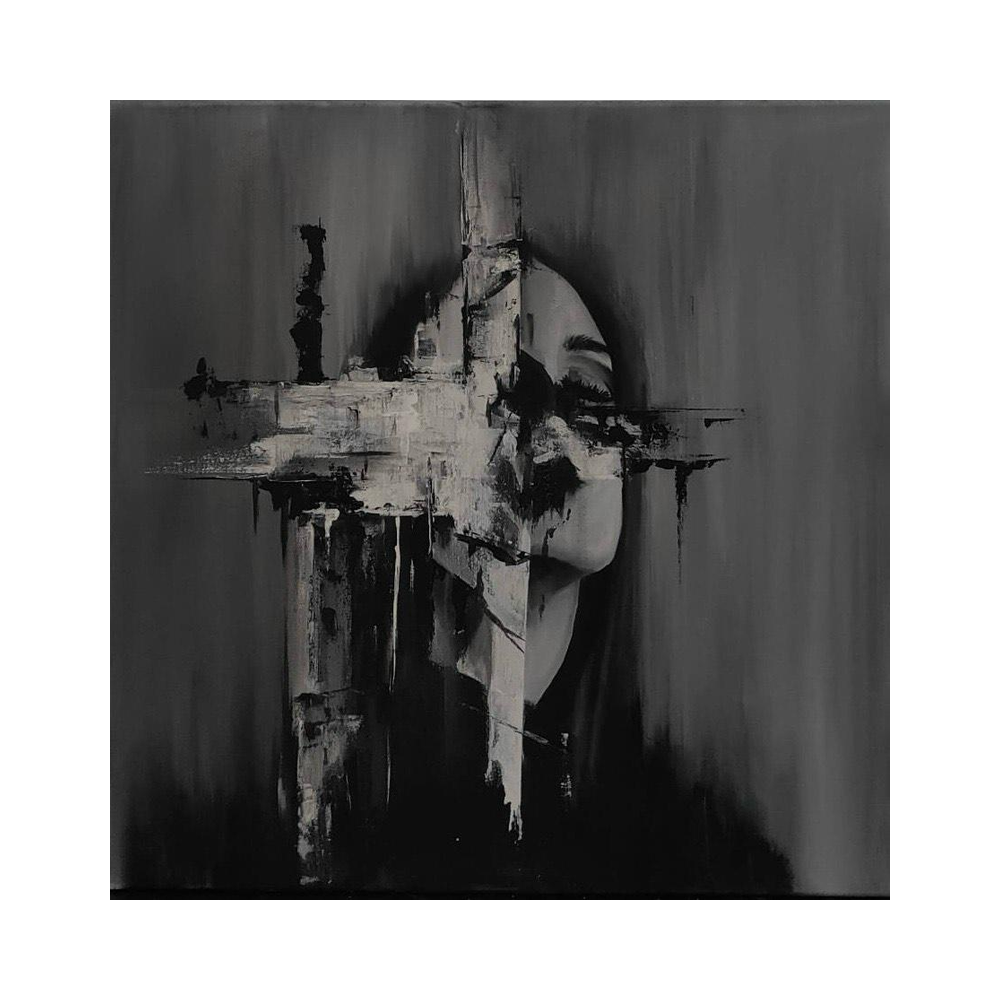 Here, the face is traversed by a painterly cross that both restrains and exposes it at once. A horizontal and vertical structure overlays the figure not as an overt symbol, but as an interruption. White expands at the center, dense and tactile; black descends downward in compact drips that weigh down the composition. The face remains only partially visible, as though emerging from behind an unstable architectural framework. The surface is not uniform: it is scratched, layered, pushed to the brink of erasure. The central axis holds the gaze in place, while the dark background intensifies the tension. In Senza Colore, this work introduces the notion of constraint. It is not dissolution, nor is it fracture. It is a forced suspension. The face does not hide. It endures within a structure that contains it and puts it to the test.