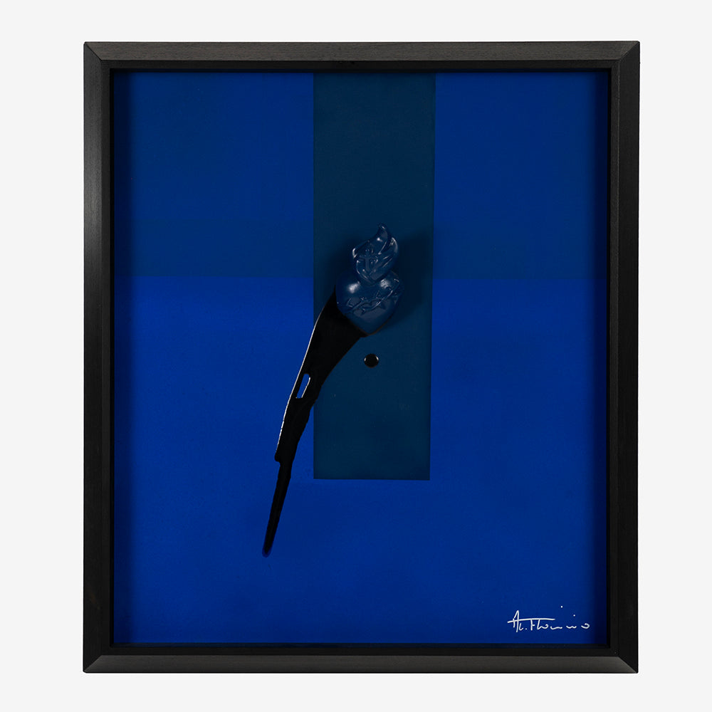 The sacred heart is deeply rooted in our culture: a symbol of religion, but above all of belonging and tradition. Flaminio presents it to us with a crown of thorns at the center and an interplay of shadows that represent the blood flowing. The sacred heart, covered in blue, evokes interiority and the sense of introspection that the symbol embodies.