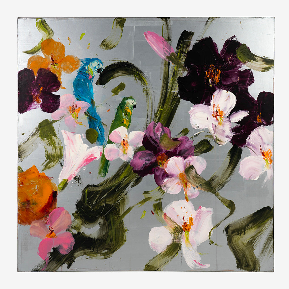 Lo sfondo grigio della tela ospita un "giardino" che richiama l'astrattismo, con fiori dai colori vivaci che si fondono armoniosamente. Due pappagalli, quasi invisibili a prima vista, sembrano confondersi tra i fiori, creando un gioco di forme e colori che invita a una visione più profonda e dettagliata.