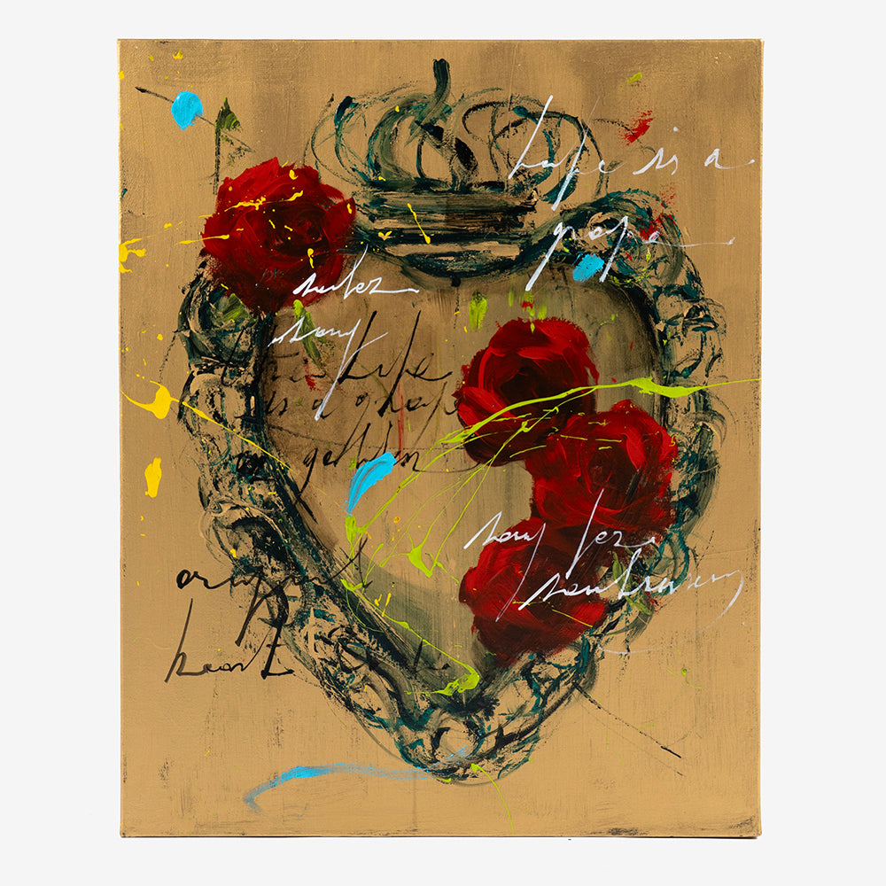 Bellandi pone il cuore al centro dell'opera, restituendogli il ruolo di protagonista. I fiori, astratti ma compatti, lo riempiono e ne amplificano la profondità emotiva, trasmettendo un messaggio intimo. È come se l'artista aprisse uno spiraglio sul suo universo interiore, rivelando sia il suo lato più fragile che quello più vivace. Le pennellate energiche danno vita alle rose, mentre le parole sparse si muovono con leggerezza, come note su uno spartito immaginario.