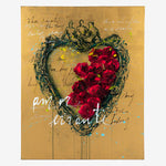 "Amor Errante" di Luca Bellandi è un'opera che mescola simbolismo e sentimento. Al centro, un cuore racchiude l'aspetto più intimo dell'artista, tra rose rosse cariche di passione e parole che sembrano sospese nel tempo. La cornice antica e lo sfondo dorato conferiscono alla scena un'aria senza tempo, dove amore e nostalgia si intrecciano in un viaggio emozionale e visionario.