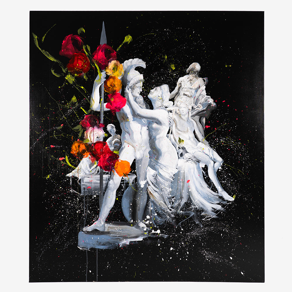 Bellandi reinterpreta questa storia mitologica con una visione vibrante e dinamica, trasformando il tradimento in una danza travolgente. Le pennellate e l'esplosione di colori conferiscono all'opera un ritmo unico, quasi musicale, come se i due amanti si muovessero al suono di un'improvvisazione jazz. Pur riprendendo la tradizione classica, l'artista imprime un proprio codice distintivo: il ventre di Marte non è scolpito nella perfezione statuaria, ma appare morbido, umano, in armonia con le rose, che nella loro forma sembrano sfiorare l'astrattismo.