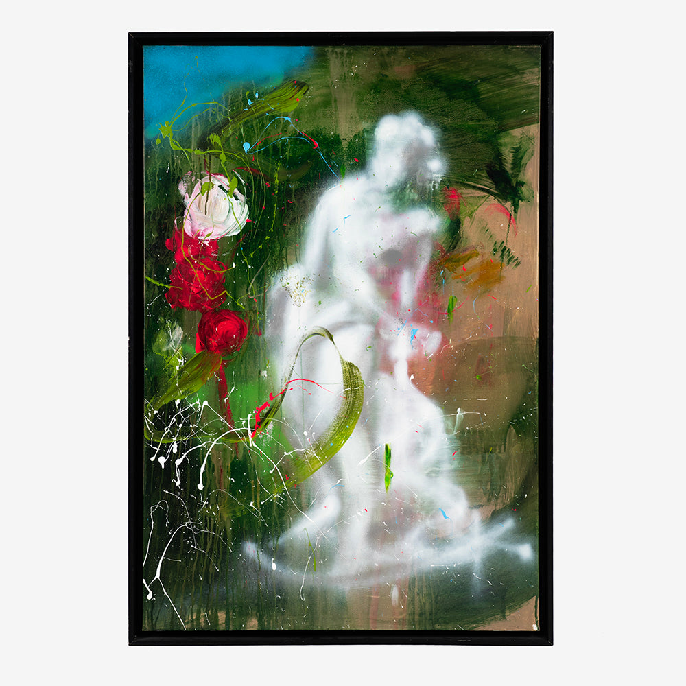 In Mythe Fantosme, la figura di una statua emerge prorompente sullo sfondo, mentre schizzi di vernice e rose astratte invitano ad andare oltre il visibile. Le statue, immobili e solenni,