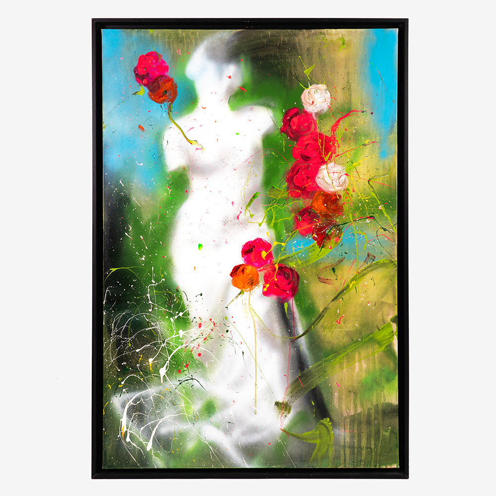 In Mythe Fantome, la figura di una statua emerge prorompente sullo sfondo, mentre le pennellate di pittura e le rose astratte ci invitano ad andare oltre il visibile. Le statue, immobili e solenni, contrastano con il dinamismo degli schizzi, creando un'opera in cui l'apparente staticità è scossa dal movimento e dall'energia della composizione.