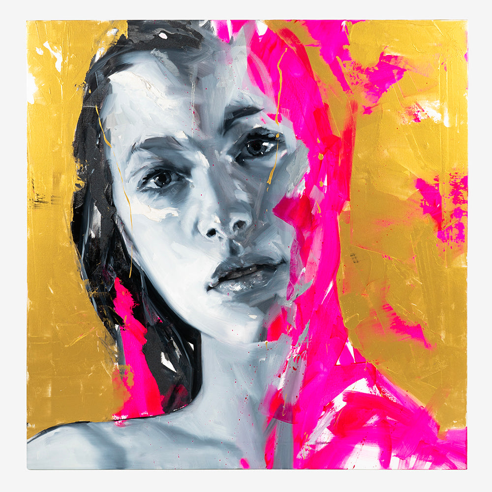 L'artista napoletano mette in risalto il volto di una donna in bianco e nero, mentre le ombre prendono vita con colori intensi, fucsia e oro, evocando introspezione psicologica e malinconia. L'uso del fucsia e dell'oro crea un netto contrasto, quasi come se fosse uno scontro tra delicatezza ed energia. Lo sguardo della donna è così penetrante e vivido che sembra una fotografia che va oltre la tela ad olio.