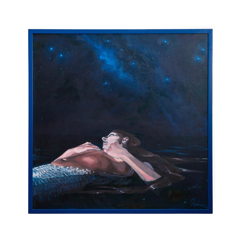 In Partenope, Pedro Perdomo affida alla notte e all'acqua una figura sospesa, in bilico tra corpo e mito. Una sirena si alza lentamente dalla superficie scura del mare, il busto inarcato all'indietro, lo sguardo sollevato verso un cielo profondo attraversato da stelle e da una luce lontana, quasi cosmica. La pittura è morbida e sobria, costruita attraverso velature che dissolvono i contorni. Il corpo non domina la scena ma galleggia al suo interno, come se condividesse lo stesso respiro dell'acqua. La coda, appena visibile, si confonde con le ombre del mare, mentre la pelle cattura riflessi freddi e lunari. Partenope non descrive una narrazione, ma una dolce resa. È un'immagine di quiete e lontananza, dove il mito diventa intimo e silenzioso, e la figura rimane sospesa tra il desiderio di emergere e la spinta dell'abisso.