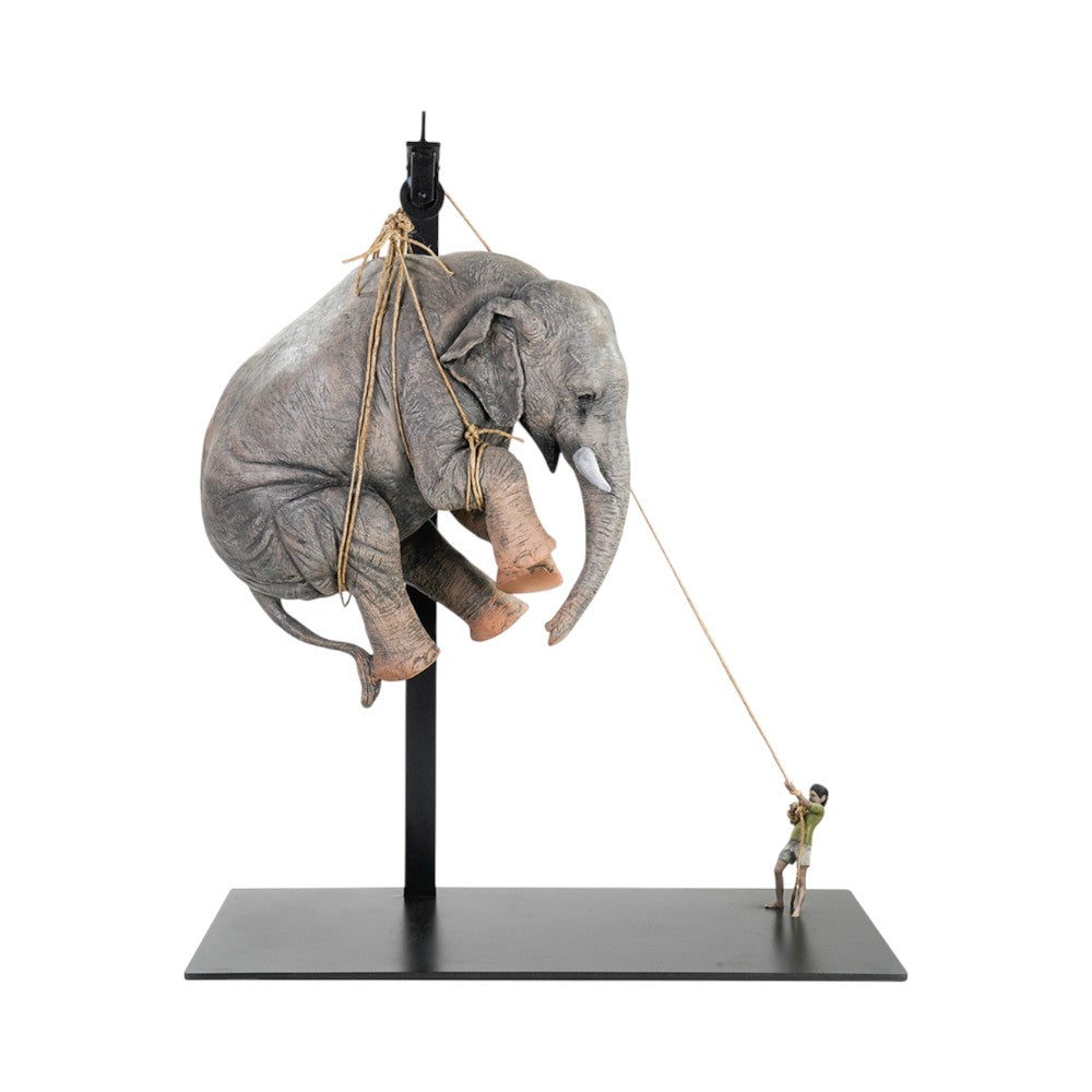 L'elefante, modellato con grande attenzione ai dettagli, appare pesante e reale, in contrasto con la piccola figura del bambino. È proprio questo squilibrio a creare l'impatto emotivo: il gesto di Elia diventa simbolo di resistenza, tenacia e capacità di affrontare ciò che è oltre la nostra misura.