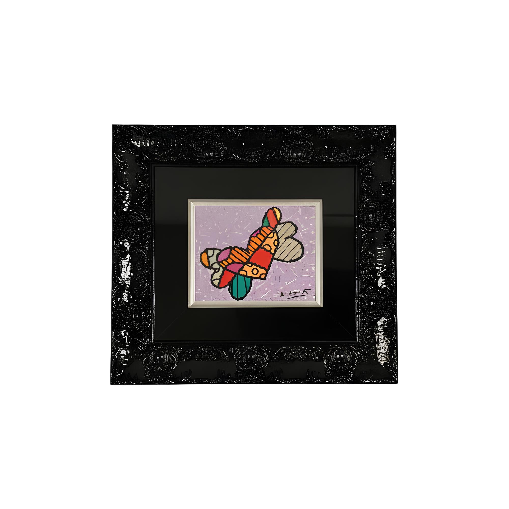 Flying Heart raffigura un cuore che sembra muoversi naturalmente nello spazio, costruito utilizzando i campi di colori audaci e i motivi geometrici caratteristici di Britto. La leggerezza della forma, abbinata allo sfondo chiaro ricamato con segni grafici, suggerisce un'idea di movimento semplice e spontaneo. Le decise linee nere mantengono compatta la figura, mentre i motivi interni, le righe, i pois e i blocchi di colore la trasformano in un gioioso mosaico. Non è un cuore statico: è un'energia che si apre, si espande e va oltre, comunicando un ottimismo immediato e riconoscibile nello stile luminoso dell'artista.