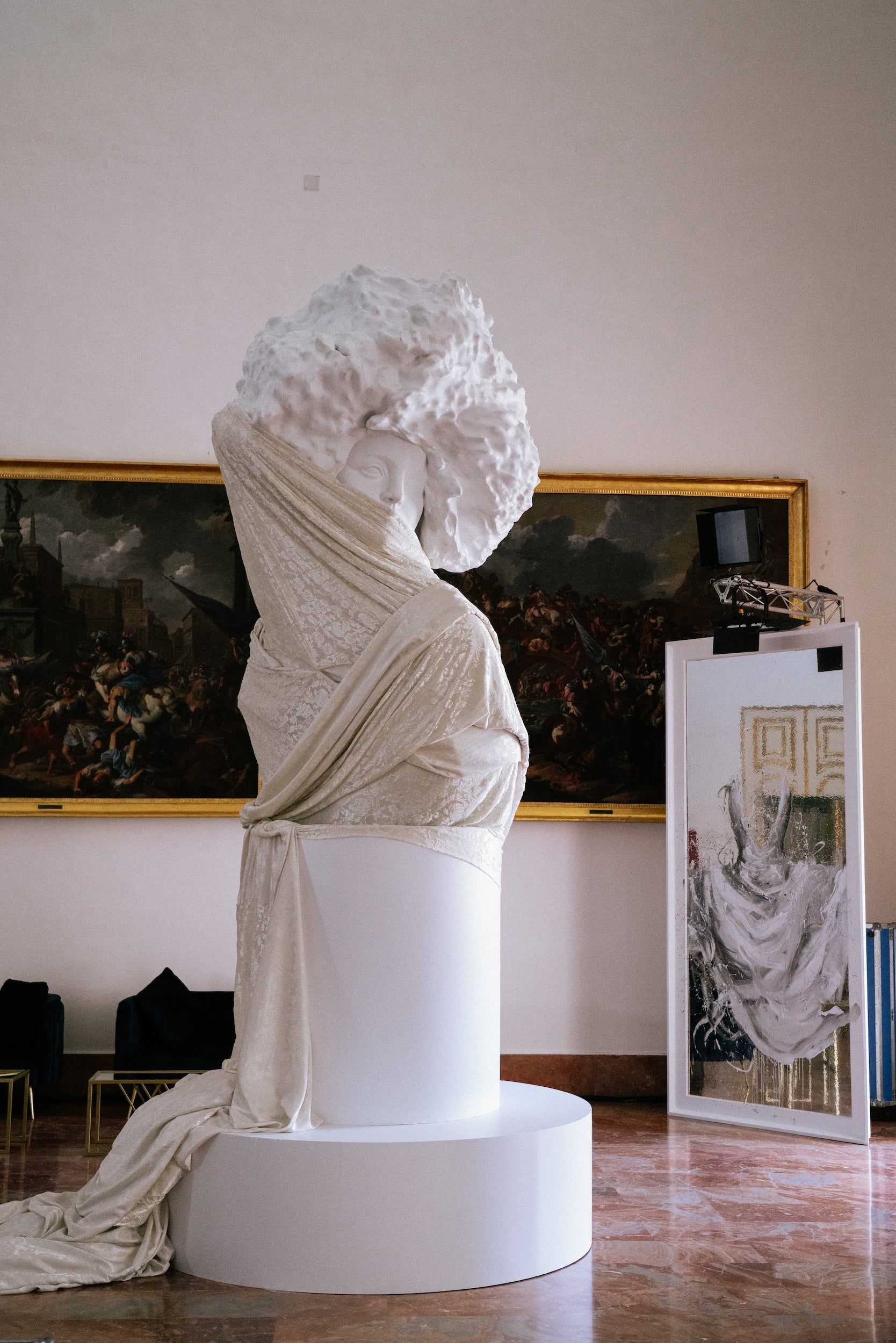 A questi si unisce il legno di Daniele Fortuna che, con le sue forme stratificate ei colori vibranti, dona ulteriori tridimensionalità alla scena e all'installazione stessa, poggiata sul tappeto scenografico di Saints Studio, maison di moda vicina al mondo dell'arte: un patchwork di seta lungo 10 metri posto ai piedi della Venere per richiamare il legame tra arte, tessuto e storia.