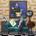Accanto a lui c’è una delle figure animali tipiche di Accardi, che aggiunge uno strato di vigilanza surreale alla scena. Motivi geometrici, pavimenti a scacchi e interventi disegnati a mano completano la composizione, creando uno spazio sospeso tra installazione, citazione e critica culturale.