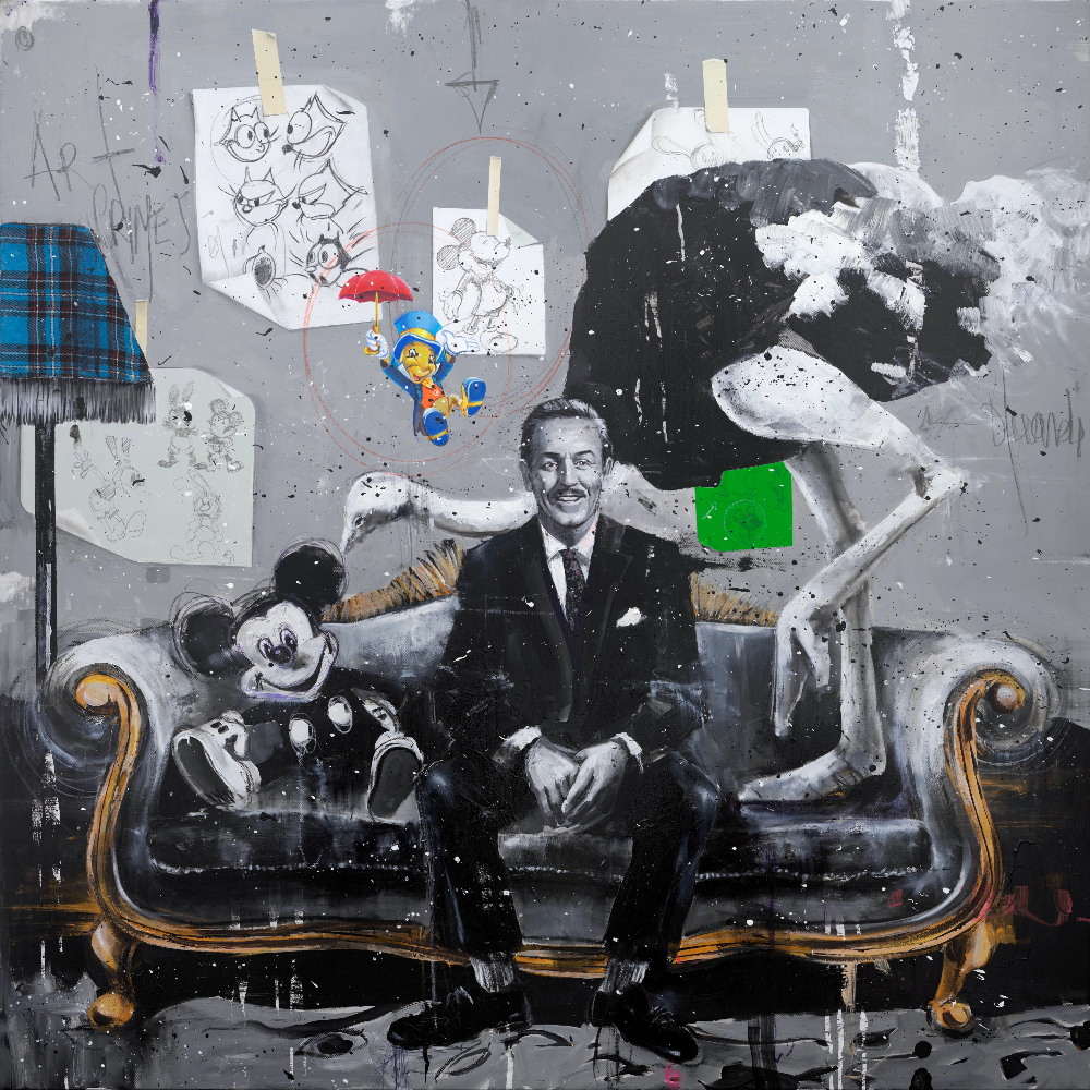 In Walt’s Crime, Angelo Accardi mette in scena un interno che dialoga apertamente con l’universo visivo Disney, reinterpretato attraverso la sua ironia e il suo approccio meta-pittorico. Sul divano siede una figura maschile in bianco e nero che ricorda un ritratto dei primi tempi, abbinata a un morbido Topolino in stile vintage, un cenno ai primissimi classici animati.