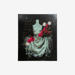Vibrant red roses and white flowers cut diagonally across the composition, creating a powerful chromatic contrast with the cool tones of the mannequin. Golden cursive script dances across the dark surface, adding a poetic, narrative layer to the work.
