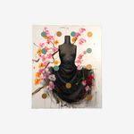 In From J. Garden, Bellandi continues his poetic vision of clothes as symbolic bodies, faceless protagonists. An elegant black dress emerges from a light background like a suspended, solemn presence, while flowering branches in delicate shades of pink and orange evoke an act of rebirth imbued with sensuality. Completing the composition, abstract circles in shades of gold and aqua green, a distinctive feature of his visual language, create a balance between lyrical gesture and contemporary contamination.