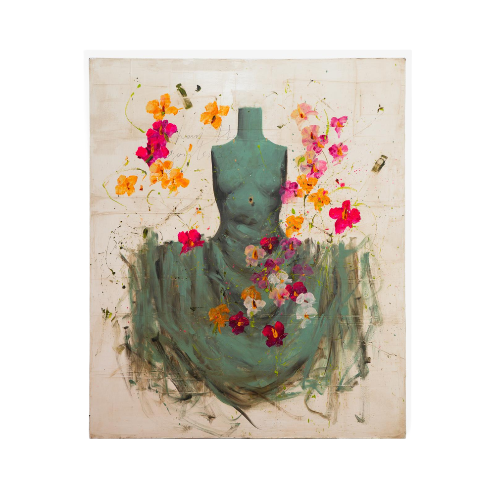 In J. Window, Luca Bellandi mette in scena una figura assente ma centrale: un busto femminile senza volto, avvolto in una superficie pittorica che sembra sbocciare direttamente dalla materia stessa. Il corpo emerge come una silhouette silenziosa, attraversata e circondata da fiori vibranti sospesi tra delicatezza e slancio vitale. Il colore opera per stratificazione: una tonalità polverosa costruisce la presenza, mentre rosa, arancio e rosso irrompono tutt'intorno come apparizioni fugaci, quasi instabili. La pennellata resta visibile e irregolare, permettendo al gesto di interrompere la forma, di aprirla, di renderla permeabile. Niente è sigillato o definitivo. La “finestra” evocata dal titolo non è un luogo fisico, ma uno spazio di soglia: tra interno ed esterno, tra figura e ambiente, tra ciò che dura e ciò che si trasforma. J. Window non racconta; lascia affiorare le cose, affidando allo sguardo il compito di attraversarle.