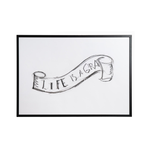 Life Is a Grape appare come una piccola pergamena contemporanea: un nastro disegnato a mano che si arriccia su se stesso, come a custodire un messaggio antico e fragile affidato al tempo. Il segno è essenziale e irregolare, volutamente esposto nella sua precarietà, trasmettendo il senso di una scrittura che si trasmette più che proclamata. La carta resta espansiva, quasi silenziosa, lasciando respirare il disegno. La frase non si afferma; scorre. Non è un'affermazione definitiva, ma un frammento di pensiero, una formula che sembra originarsi da un altrove indeterminato, sospeso tra ironia e intuizione. In questa riduzione estrema dell'immagine, Bellandi affida alla semplicità del gesto e alla forma pergamenacea il compito di evocare memoria, passaggio e trasmissione. Un lavoro che non spiega, ma tramanda qualcosa.
