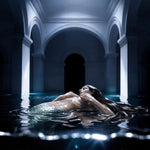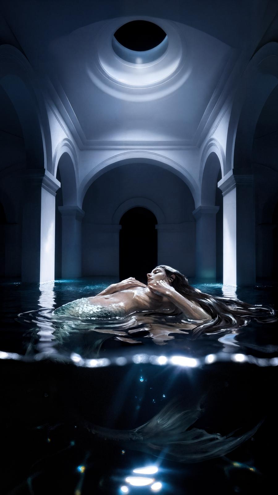 La scena si svolge all'interno di uno spazio architettonico classico, solenne e silenzioso, trasformato in una vasca d'acqua scura e riflettente. Una figura femminile emerge e galleggia in superficie, in uno stato di abbandono e di assoluta immobilità. Il corpo non è protagonista narrativo, ma veicolo simbolico: diventa anima, presenza liquida, memoria incarnata.