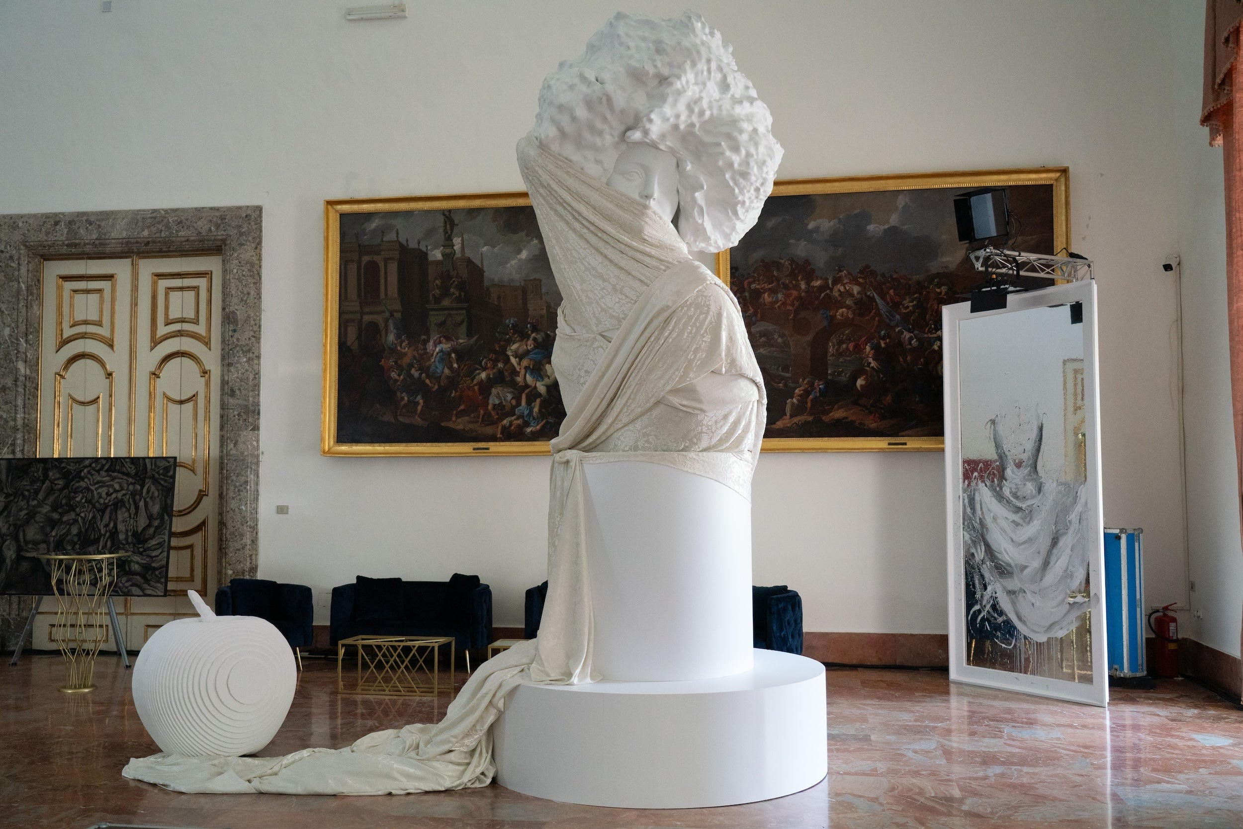 Gli artisti protagonisti della serata hanno unito le forze combinando materiali tradizionali e alternativi, giocando con superfici lucide, trasparenze e riflessi per amplificare il messaggio. Alla resina bianca laccata di Angelo Accardi, che conferisce un aspetto marmoreo alla scultura, si aggiunge il dipinto su plexiglass di Luca Bellandi, riflesso da uno specchio, in un'illusione ottica di trasformazione creata dalla sovrapposizione del dipinto al drappo della scultura.